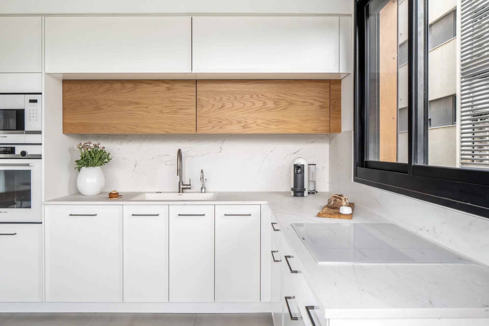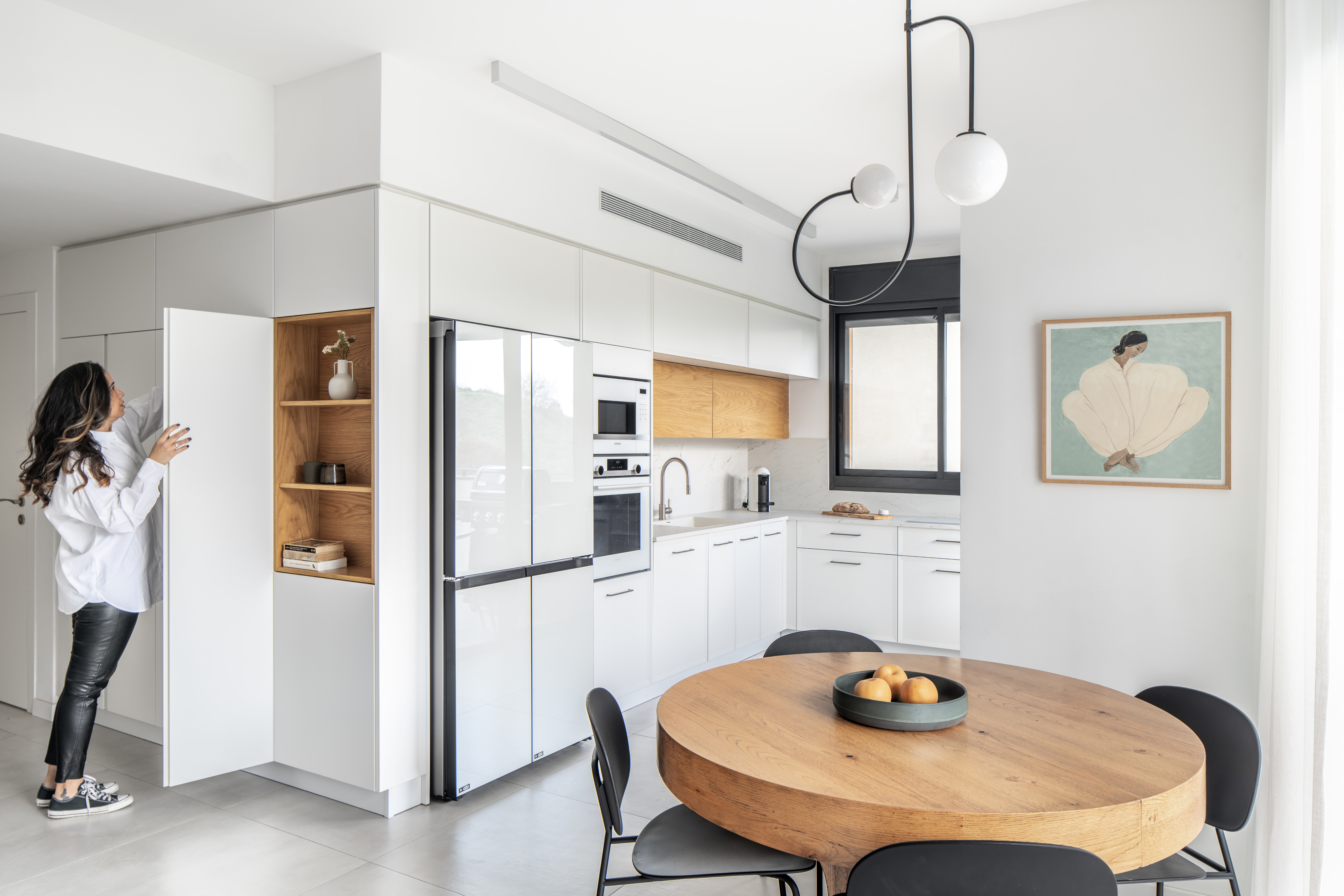 את המטבח ״משכנו״ מעבר לפינה, לכיוון המסדרון ויצרנו מזווה גדול, משולב ביחידה פתוחה שתשרת גם את הכניסה לבית.