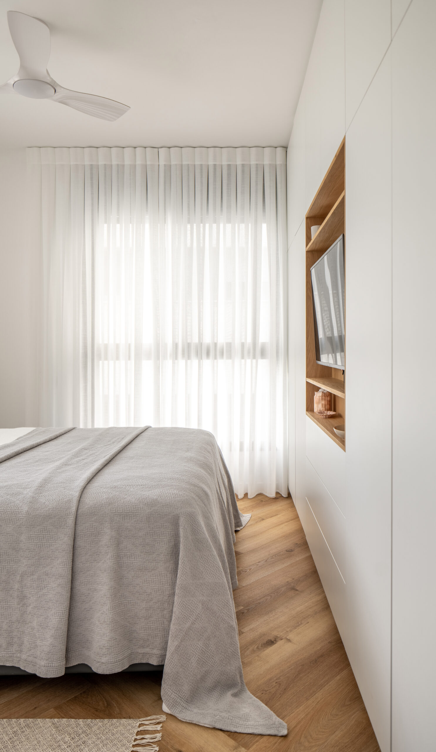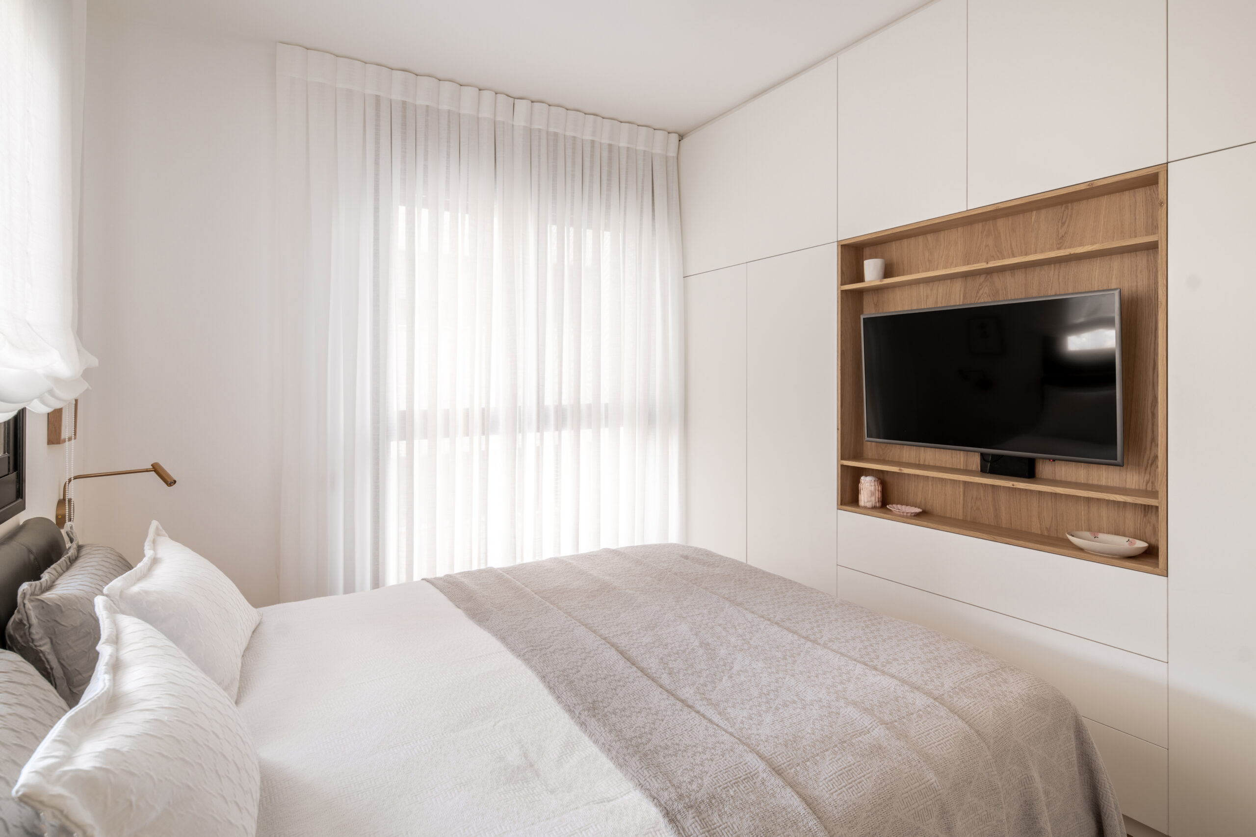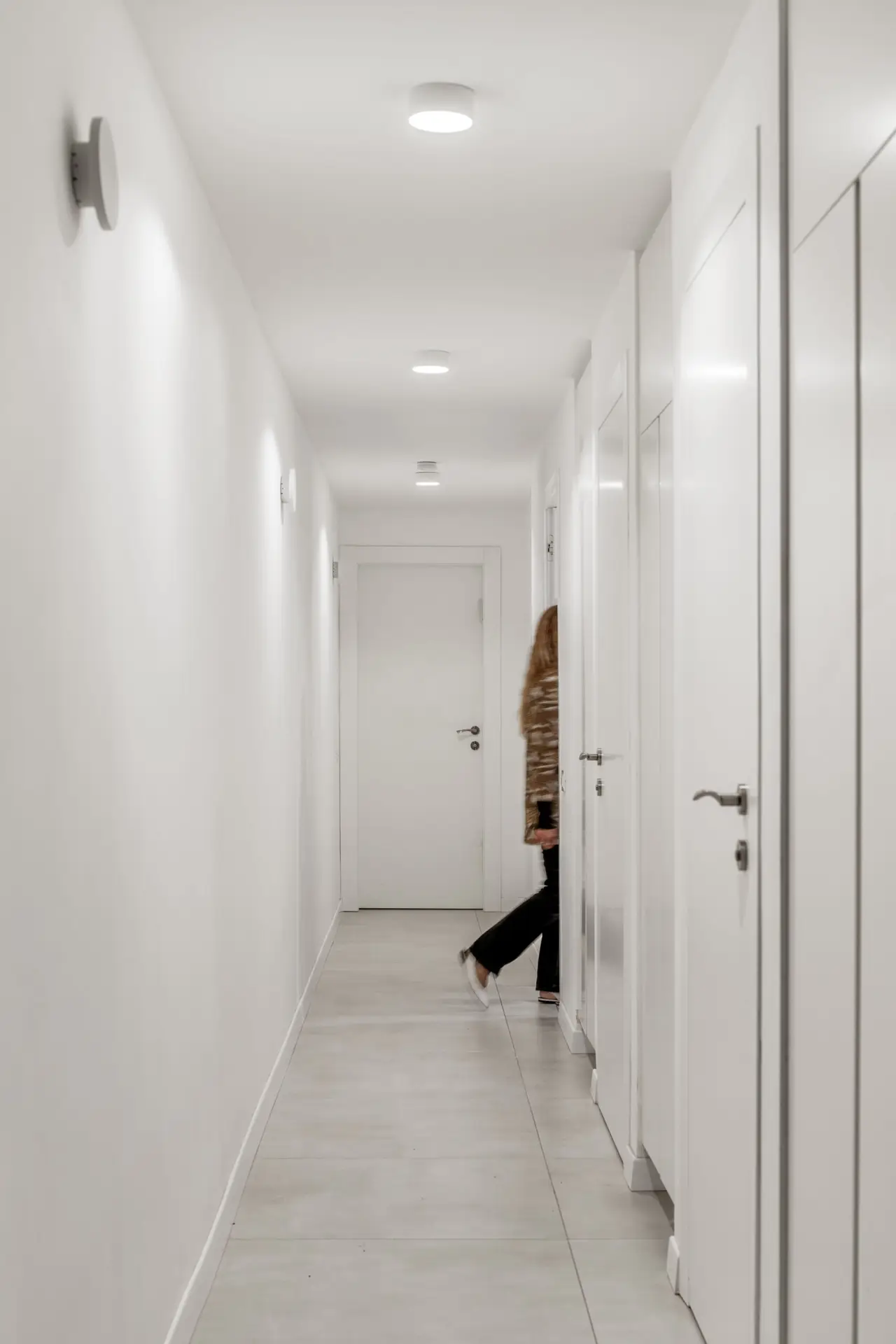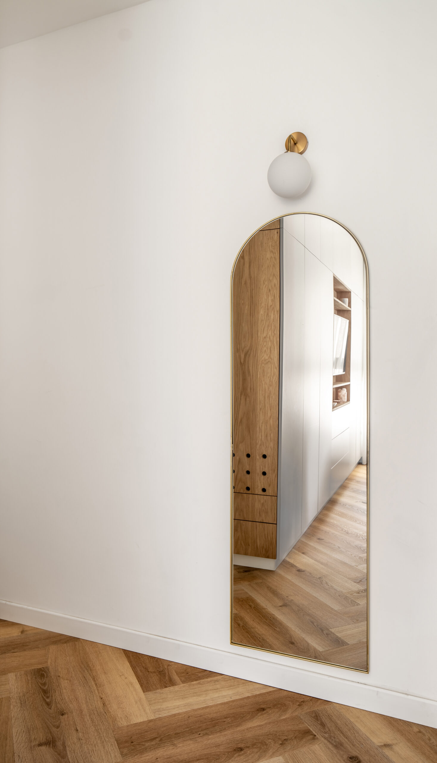במקום מסדרון ארוך ובלתי מנוצל, יצרנו לאורך כולו ארונות ונישות, על מנת לייצר אחסון פרקטי ויפה.