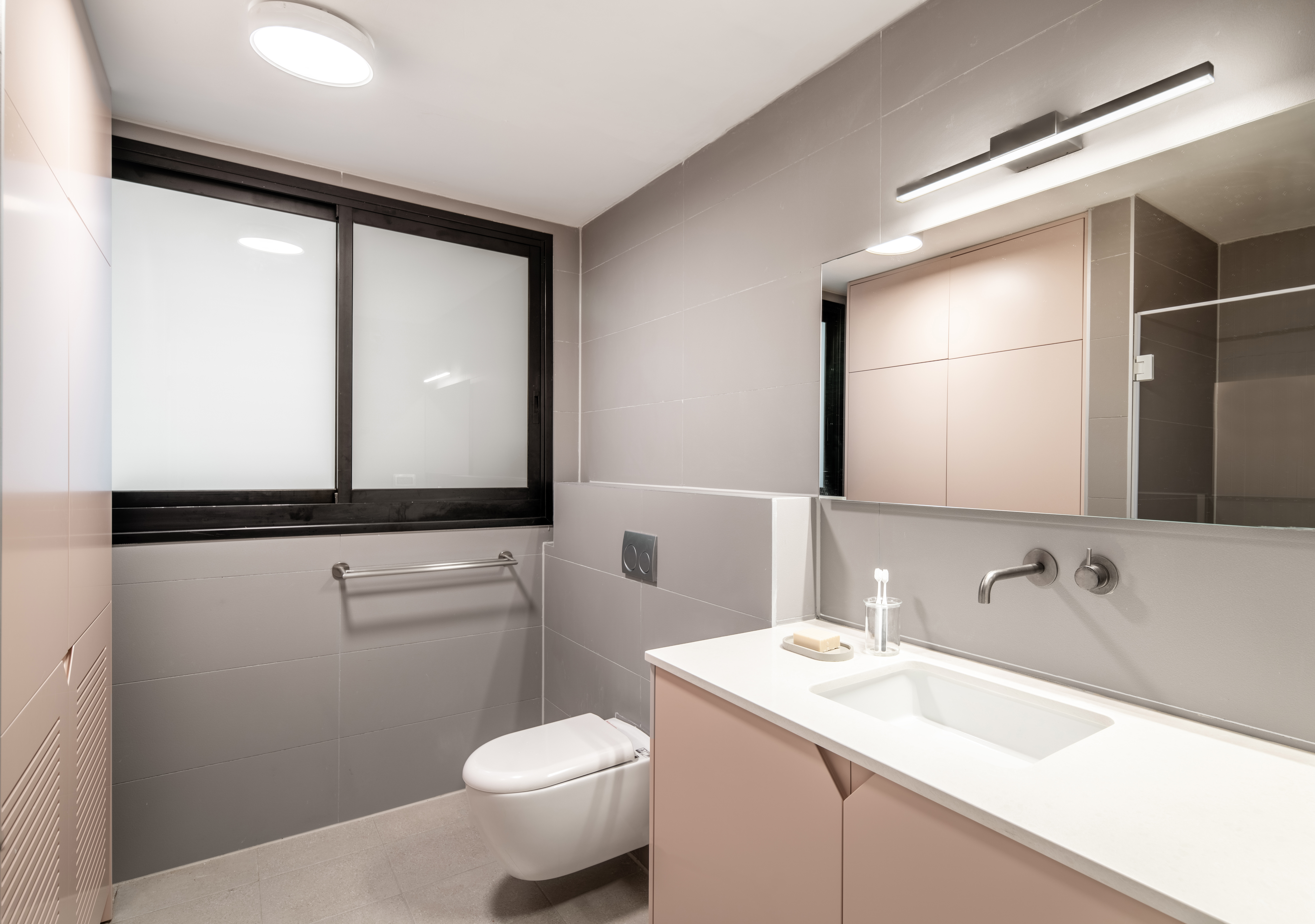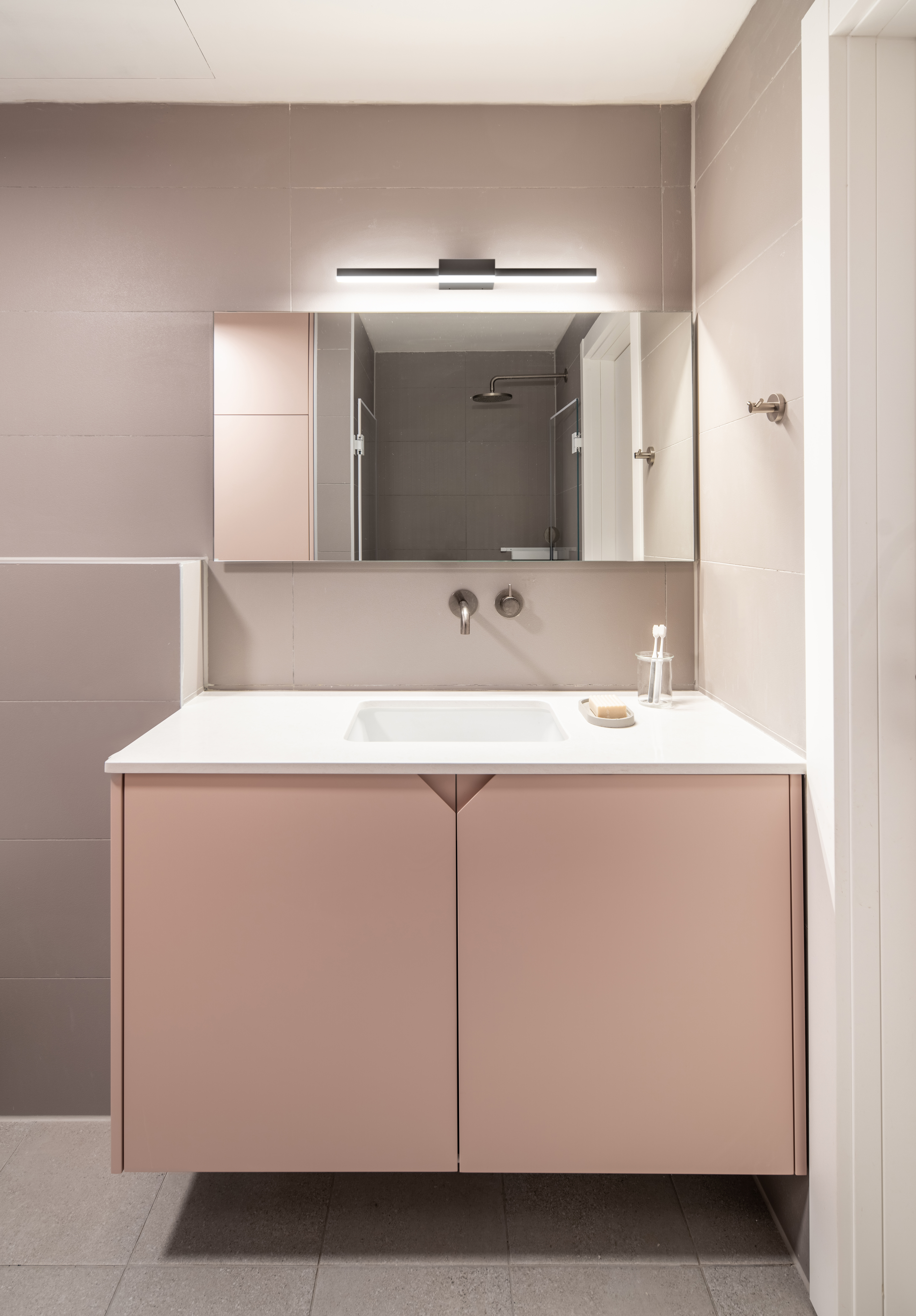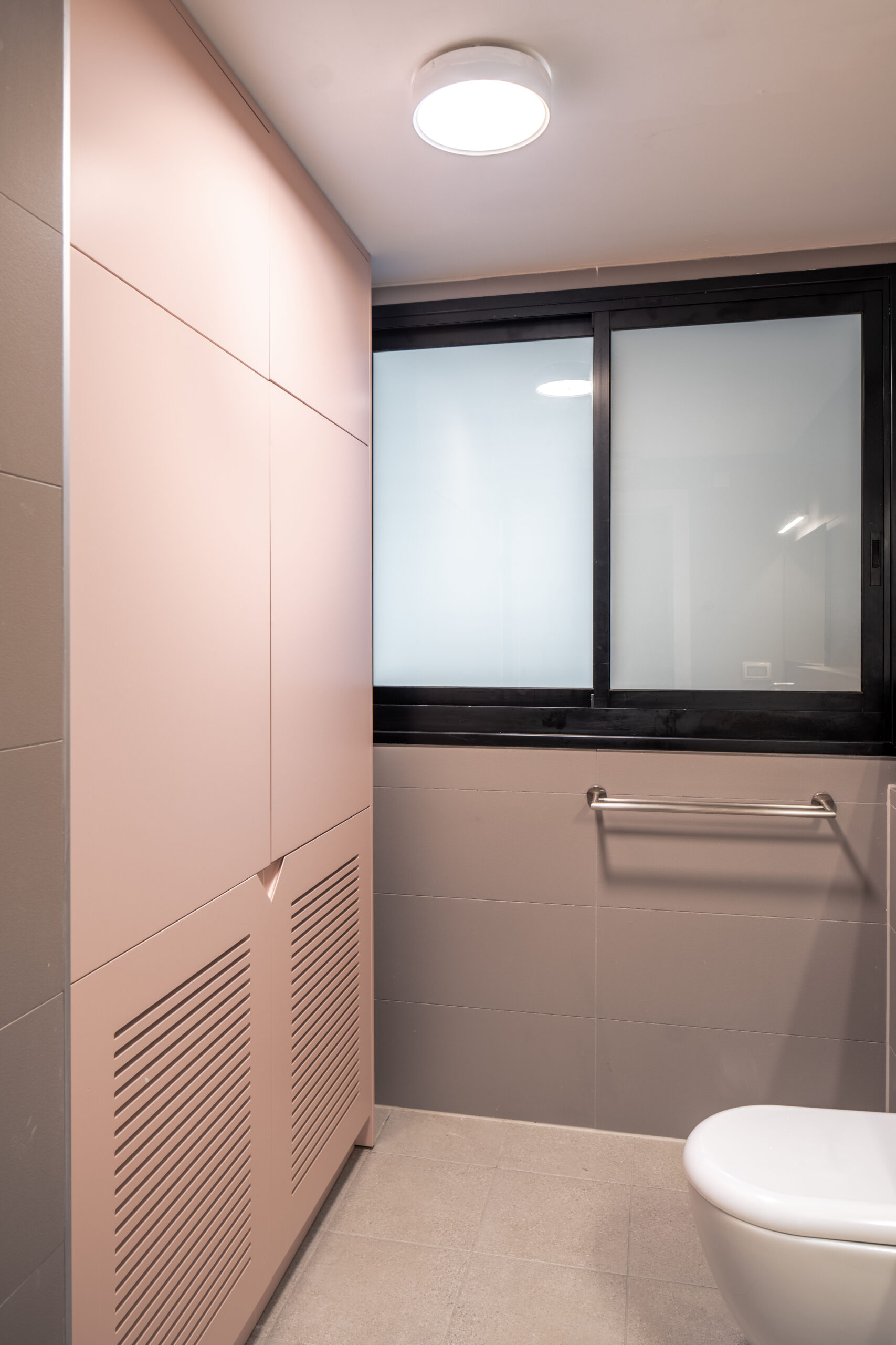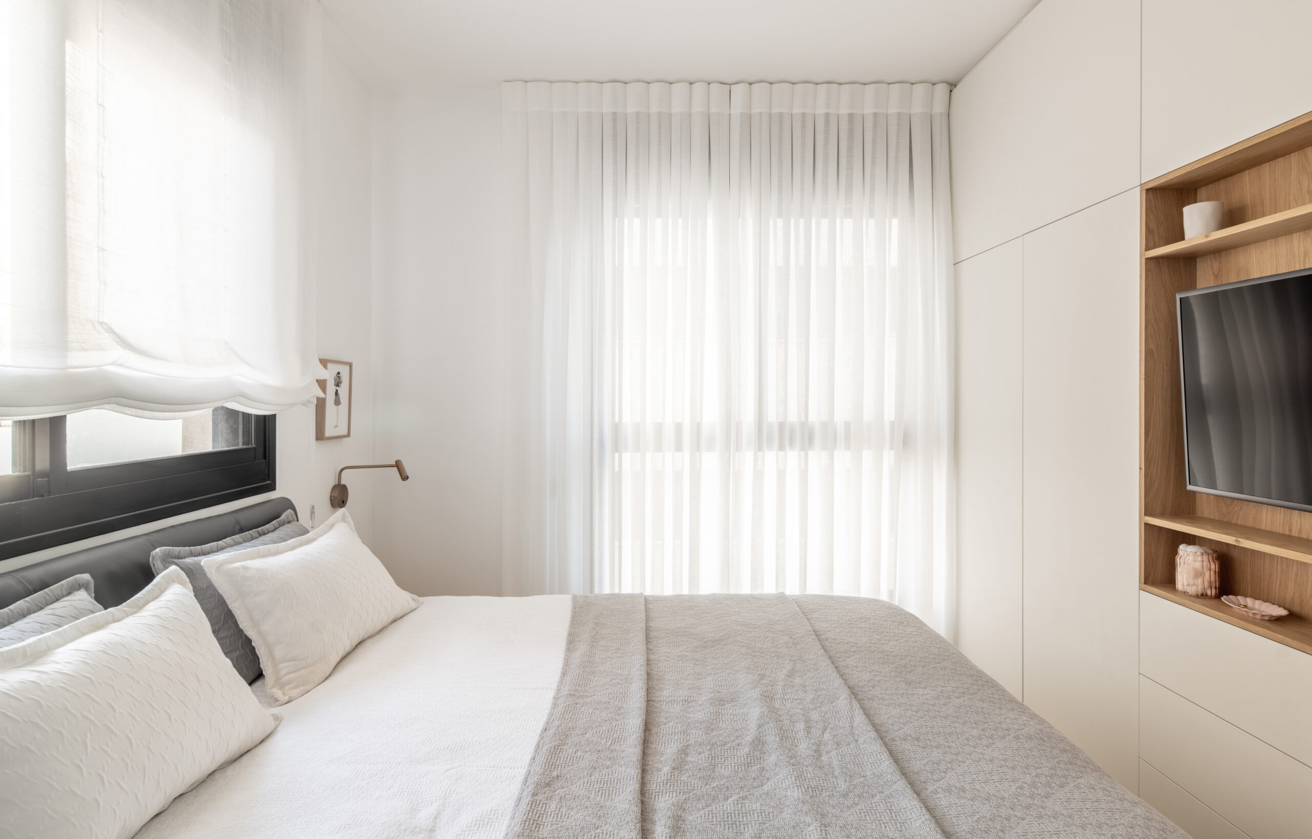 במקום מסדרון ארוך ובלתי מנוצל, יצרנו לאורך כולו ארונות ונישות, על מנת לייצר אחסון פרקטי ויפה.